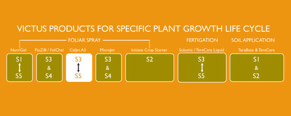 CalJet A3 is a specialty plant nutrition product designed for foliar application to optimize plant productivity at specific growth stages of the crop. CalJet foliar program is to be applied alone or in combination with compatible nutritional products like FloZib, MicroJet, FolChel and PentaMag. CalJet foliar application is recommended during the crop growth stages - rapid vegetative growth (S3), flowering and fruiting (S4) and crop maturation (S5).