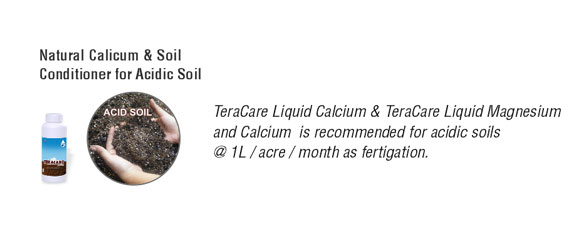TeraCare Liquid is available in two variants - TeraCare Liquid Calcium & TeraCare Liquid Magnesium and Calcium. TeraCare Liquid Calcium & TeraCare Liquid Magnesium and Calcium is recommended for acidic soils at the rate of 1 Liter per acre per month as fertigation.
